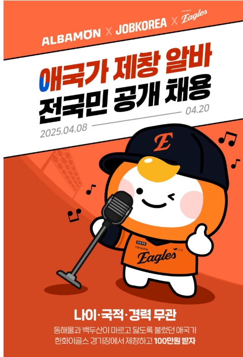 [잡코리아 (유)] | [알바몬X한화이글스] 일급 100만원 애국가 제창 알바 | 알바몬